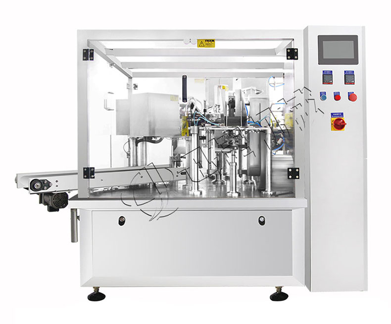 全自動給袋式醬料包裝機(jī)由給袋式包裝機(jī)、醬料灌裝機(jī)配套組成,帶醬料攪拌裝置,防止微顆粒物料沉淀,帶料位控制裝置。全自動給袋式醬料包裝機(jī)適用于包裝醬料、漿體物料,如烤肉醬、燒烤醬、番茄醬、辣椒醬、豆瓣醬等物料的袋裝。本全自動給袋式醬料包裝機(jī)符合食品加工機(jī)械的衛(wèi)生標(biāo)準(zhǔn)。機(jī)器上與物料和包裝袋接觸的零部件均采用符合食品衛(wèi)生要求的材料加工,保證食品的衛(wèi)生和安全。包裝袋類型有自立袋(帶拉鏈與不帶拉鏈)、平面袋(三邊封、四邊封、手提袋、拉鏈袋)、紙袋等復(fù)合袋。